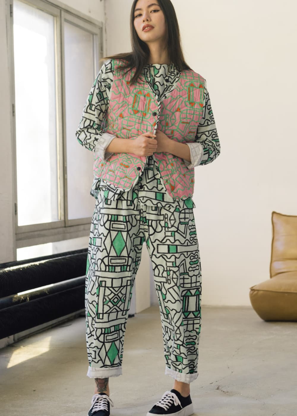 Our best selling gilet is back, this time in two new playful Driftstate prints. Featuring pockets and reversible design (yep, you read that right!), this gilet has black, chalk, and bright green on one side and pink, green, and red on the other. Perfect for layering over anything from jackets to dresses, all made from sustainable organic cotton and linen. And the quilting? Also organic cotton, because we're all about that plastic-free life, baby! Get ready to mix and match with endless possibilities.
